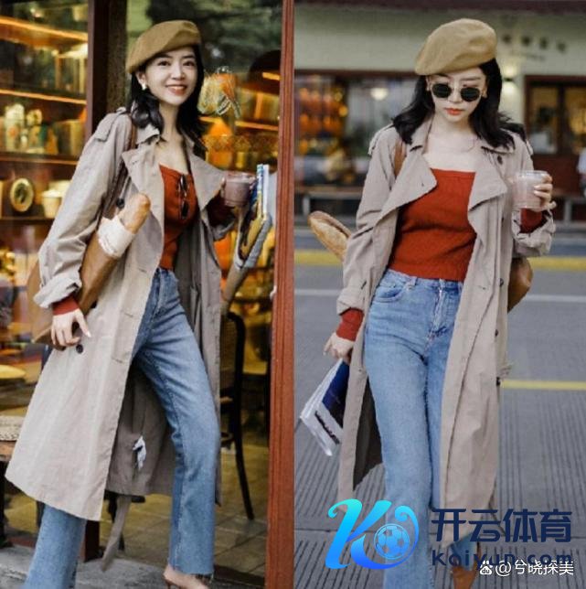 比喻上头这身风衣造型就很可以,灰、红、蓝三种神采叠搭,恬逸中透着高档感又显活力,也好意思得相配精熟。