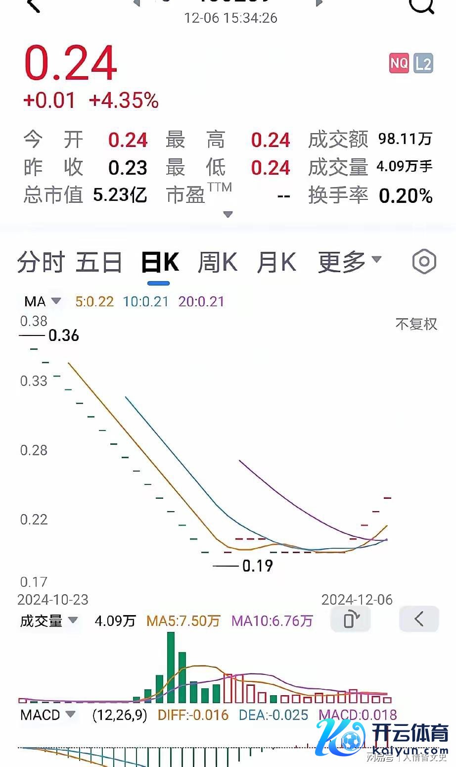 我试着挂单卖了,可是卖不出去,即是相连十多个跌停,跌到0.19元时止跌了,这工夫由于股价太低,跌一分即是跌停,涨一分即是涨停,八成是百分之五的涨跌幅。其后从0.19涨到了0.24元,这5分线是5个涨停板的功劳。