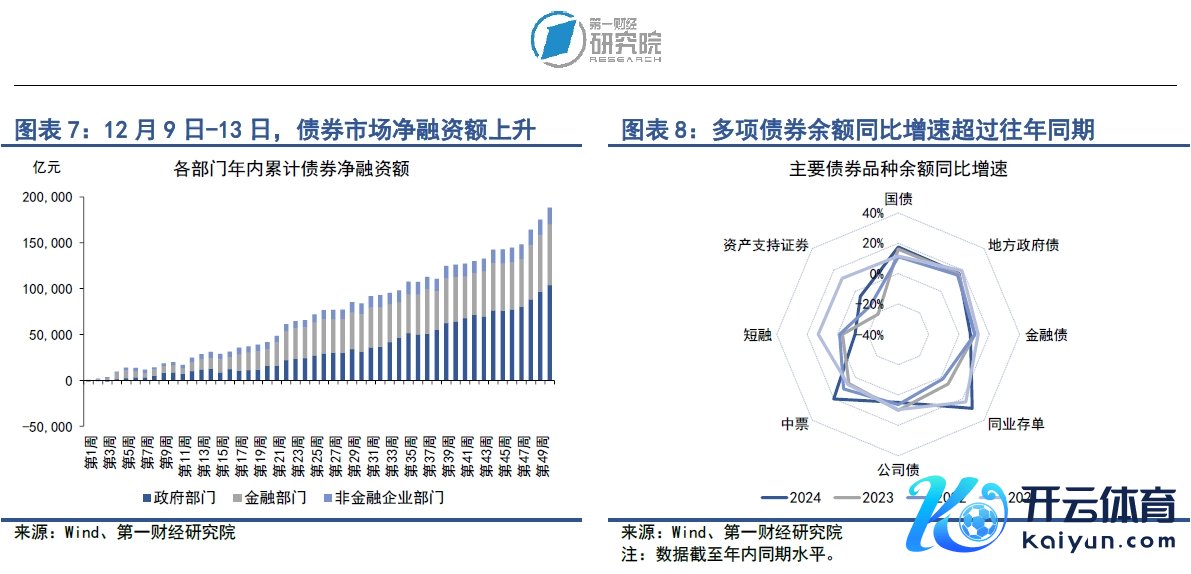 在12月9日至13日当周,债券市集刊行额和净融资额均较前一周上升。其中,债券市集总刊行额为2.22万亿元,较前一周上升4505.17亿元;债券市集净融资额为1.29万亿元,较前一周上升1946.22亿元。从融资结构来看,近三周政府部门债券净融资大幅上升带动通盘债券市集融资高增。在政府部门中,上周地方政府专项债净融资6671.41亿元,其顶用于“化债”的再融资专项债净融资6574.1亿元。把柄11月东说念主大常委会所公布的“化债”决策,自2024年起,我国将承接五年每年再行增地方政府专项债券中安排8000亿元,有益用于化债,同期东说念主大常委会批准6万亿元债务名额,分三年实行,这意味着本年地方政府专项债独特刊行额度将达到2.8万亿元。自东说念主大常委会公布“化债”决策之后,地方政府再融资专项债已累计融资跳动1.8万亿元,年内仍有近1万亿元的地方政府专项债有待刊行。