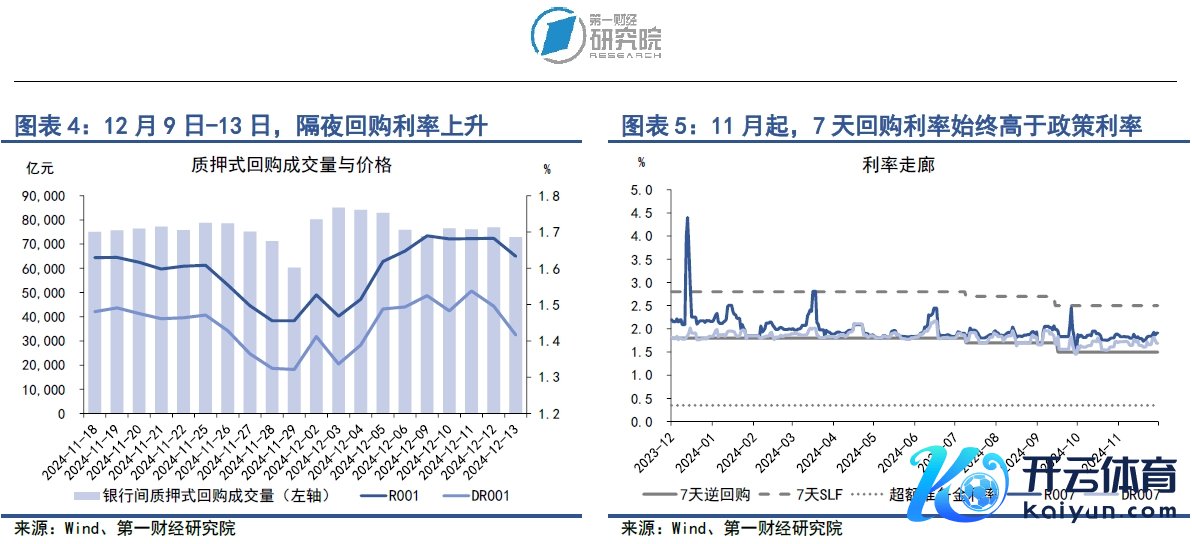 在12月9日至13日当周,银行间市集流动性边缘收紧,主要体刻下质押式回购成交量下滑以及货币市集利率上升。上周银行间市集质押式回购成交量均值为7.51万亿元,较前一周下降6531.8亿元。在主要货币利率中,上周R007与DR007利率均值分手为1.9%和1.75%,分手较前一周上升11.16bp和10.62bp。值得把稳的是,近期7天回购利率呈现明显的上升趋势,而况恒久高于1.5%的计渔利率,这背后可能有两方面的因素:一方面,年底快要,金融机构的资金需求大增,流动性收紧;另一方面,近期国债收益率快速下降带动债券价钱走高,金融机构加杠杆参预债市的当作有所增多。央行保抓充裕的流动性投放,投放范围基本与到期范围相吻合。12月15日,共有1.45万亿元的1年期MLF到期,而央行续作MLF基本要比及当月20日之后,这亦然导致上周银行间市集举座资金面偏紧的原因之一。
