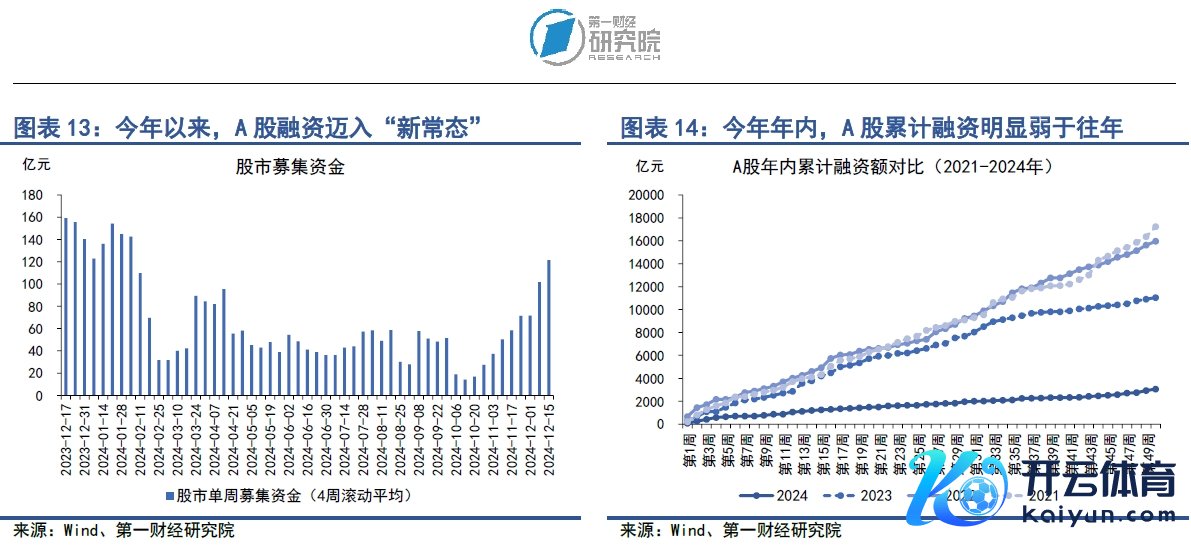 在12月9日至13日当周,A股融资总和为127.85亿元,较前一周下降51.06亿元。近两周,跟着A股市集行情飞扬,一级市集融资情愫较此前回暖,但值得把稳的是,刻下融资主要集结于增发,IPO范围也曾有限。上周,在A股融资总和中,IPO金额仅为12.85亿元,增发金额为110.5亿元。从年内来看,本年A股累计融资为3059.41亿元,弱于往年同期。