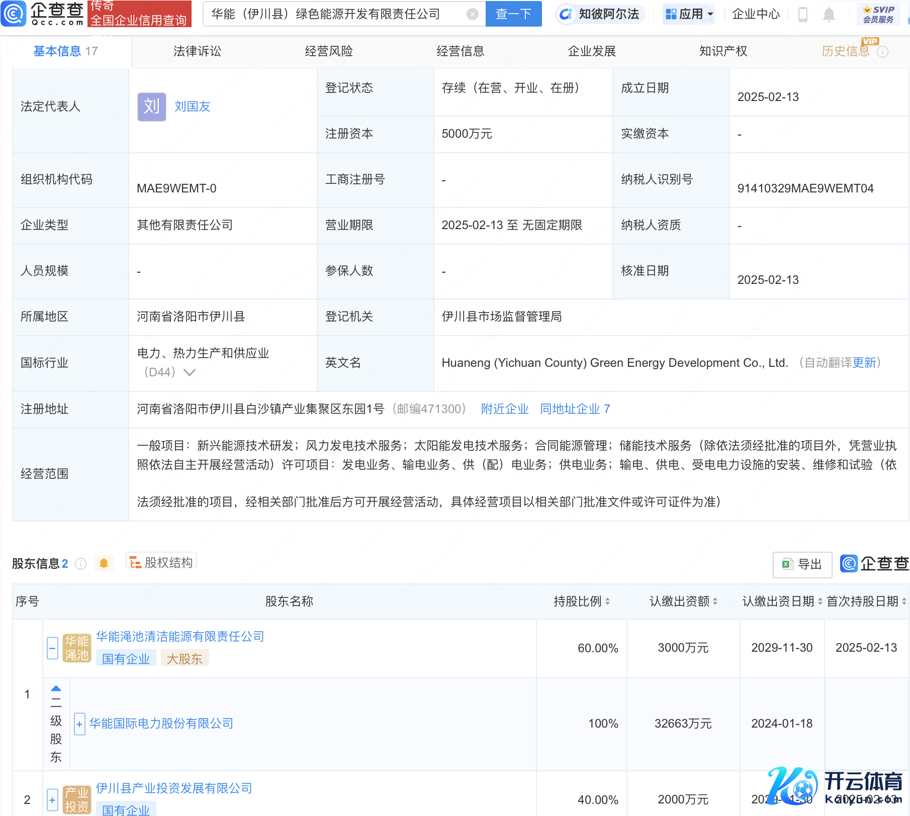 企查查APP显现,近日,华能(伊川县)绿色动力开发有限牵累公司开辟,法定代表东说念主为刘国友,注册成本5000万元,见地领域包含:新兴动力技巧研发;风力发电技巧事业;太阳能发电技巧事业;条约动力责罚等。企查查股权穿透显现,该公司由华能海外(600011)全资子公司华能渑池清洁动力有限牵累公司等共同握股。