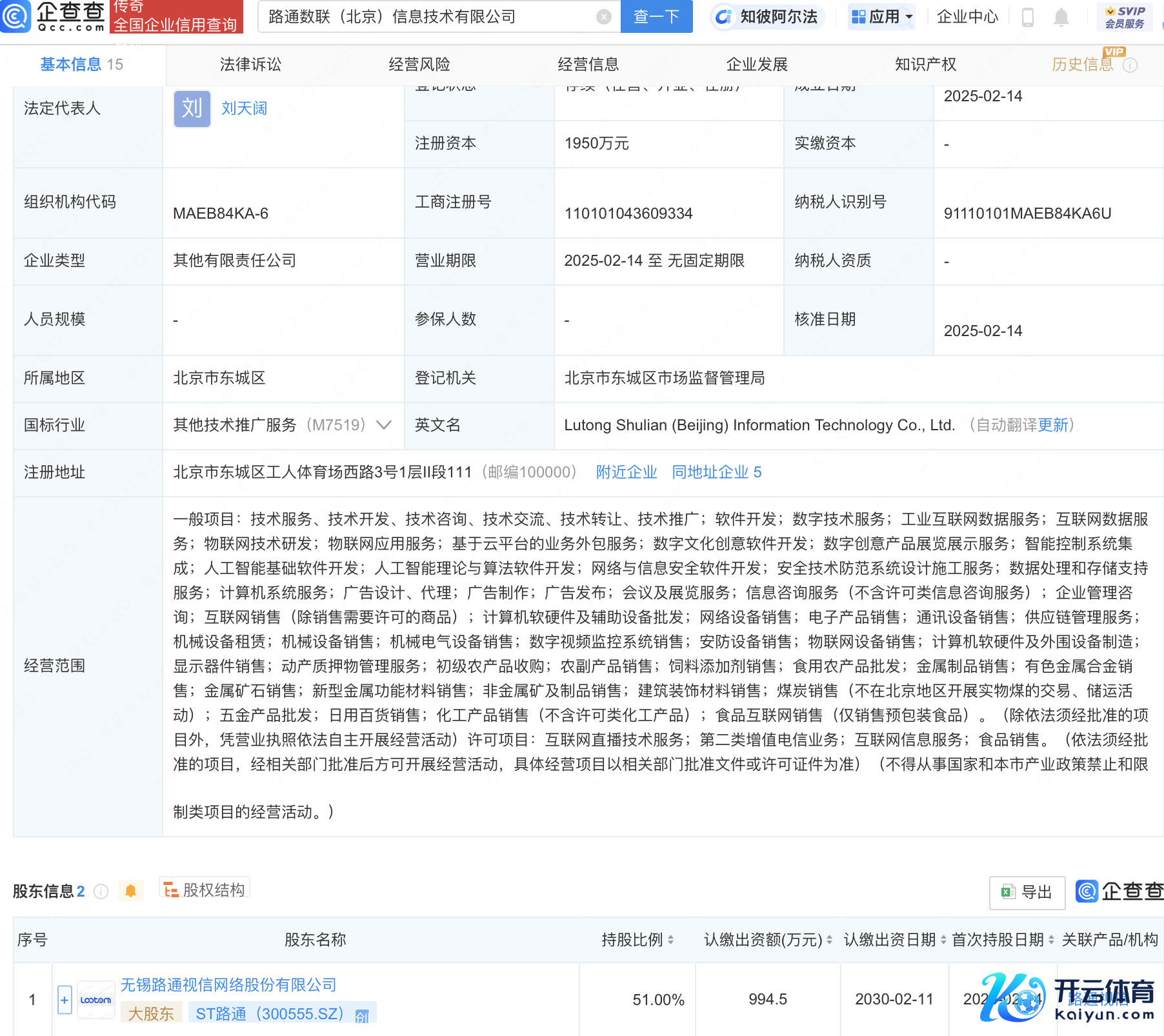 企查查APP通晓,近日,路通数联(北京)信息技巧有限公司开辟,法定代表东说念主为刘天阔,注册成本1950万元开云体育,方向边界包含:东说念主工智能基础软件开辟;东说念主工智能表面与算法软件开辟;相聚与信息安全软件开辟;安全技巧防护系统盘算施管事事等。企查查股权穿透通晓,该公司由ST路通(300555)等共同合手股。
